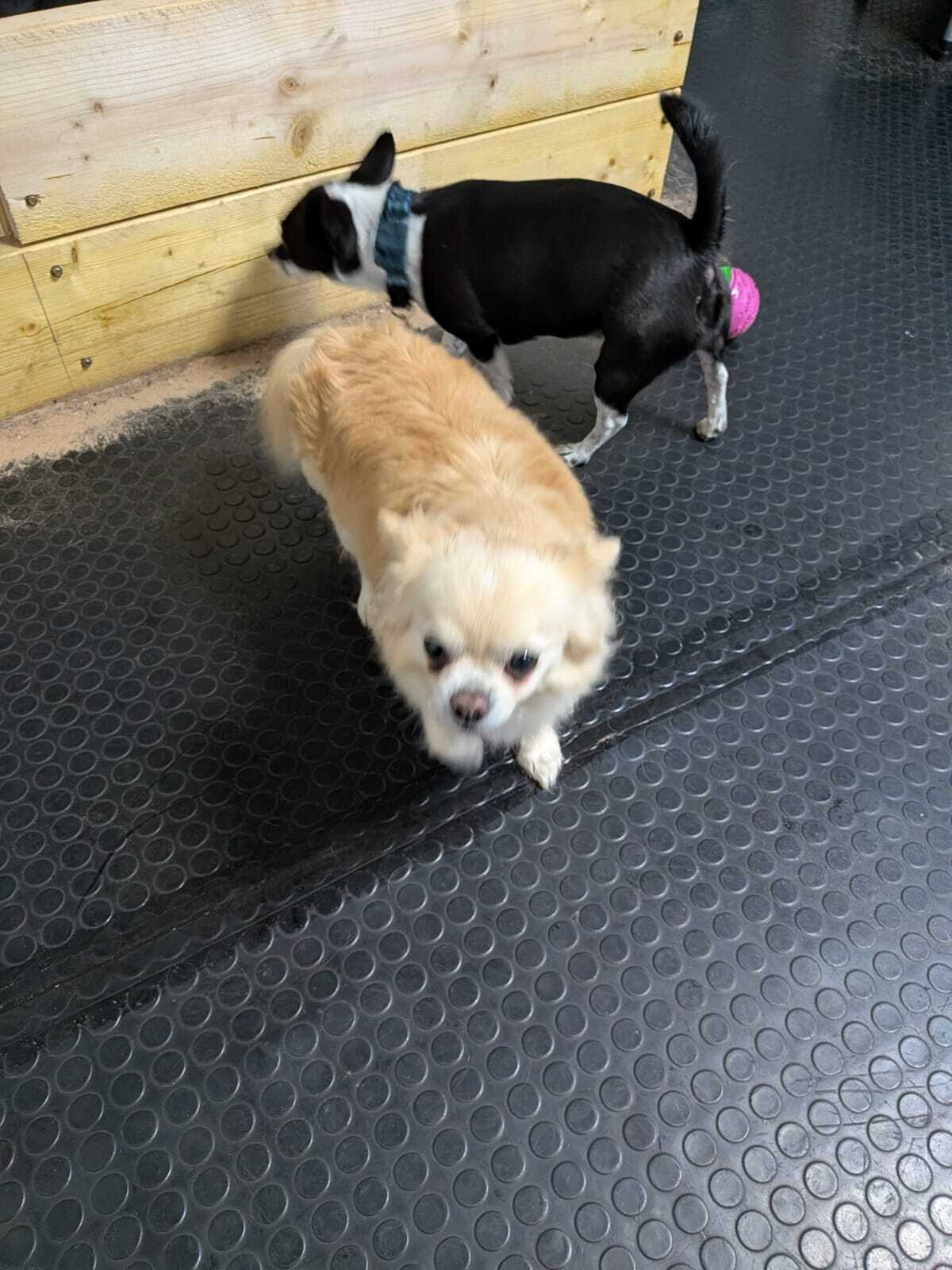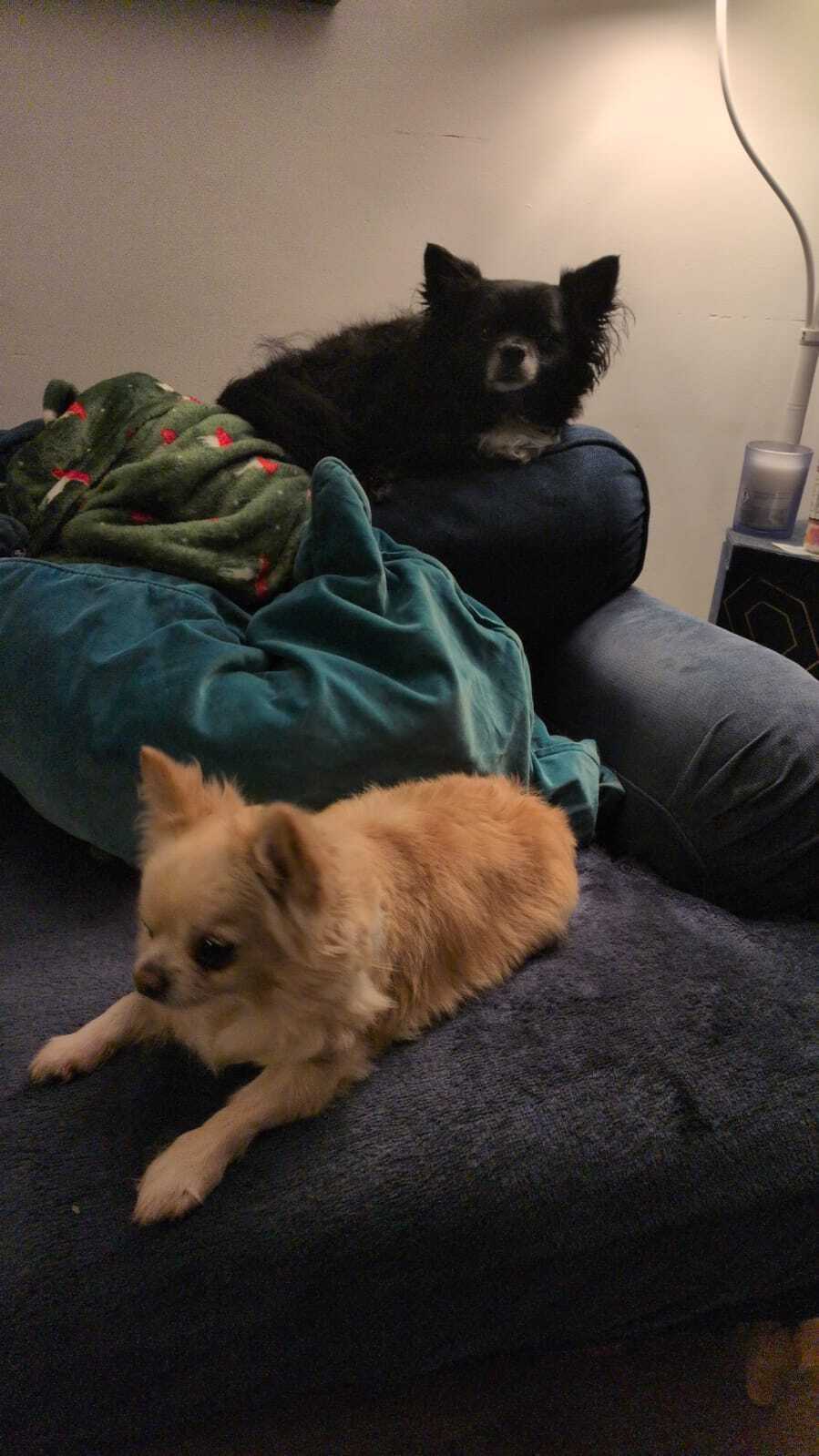 I’m Bramble, the black Pomchi. They think I'm around 9½ years old, but they can't be sure and I can't remember. That can happen when you get a bit older. Anyway, this is my very dear friend Bentley, although we all call him Benny, a gold Chihuahua estimated to be about 8½ years old. We’re a closely bonded pair of boys and are looking for a home together.